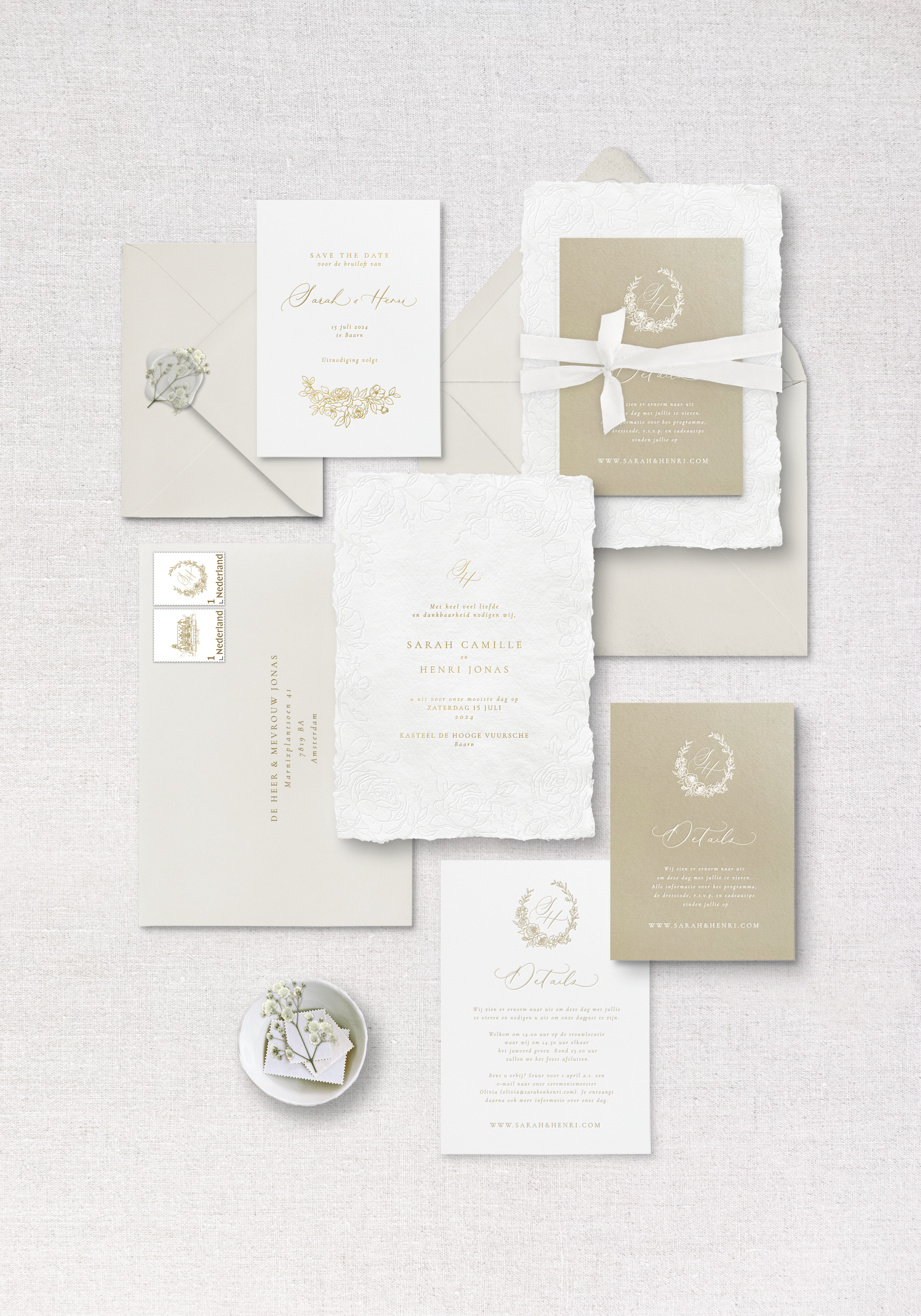 bevat 6 uitnodigingssets met een echte La Lettre signaturestijl die wij ontwerpen en aanpassen naar jullie wensen en stijl. Perfect voor de bruidsparen die dol zijn op de stijl van La Lettre