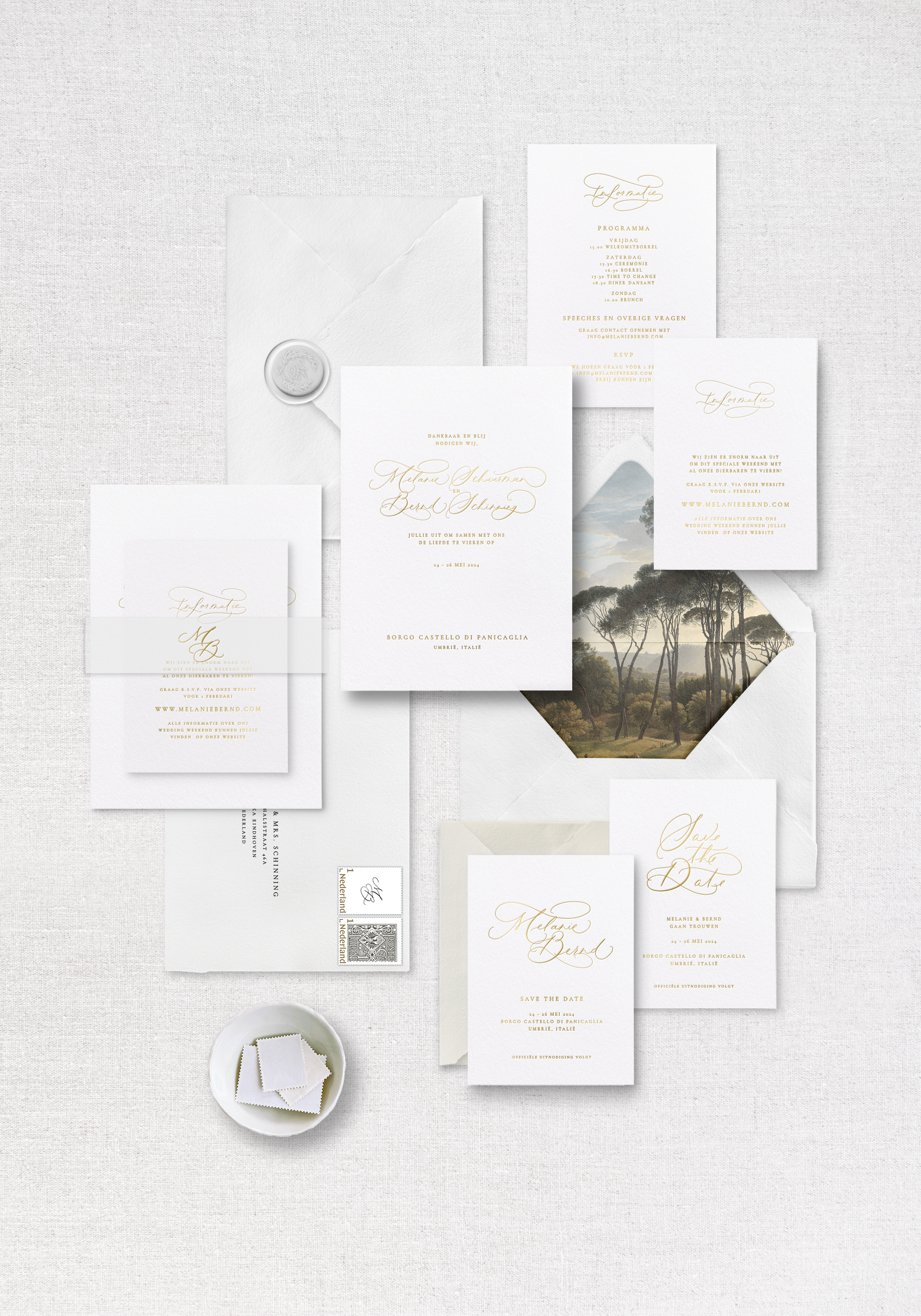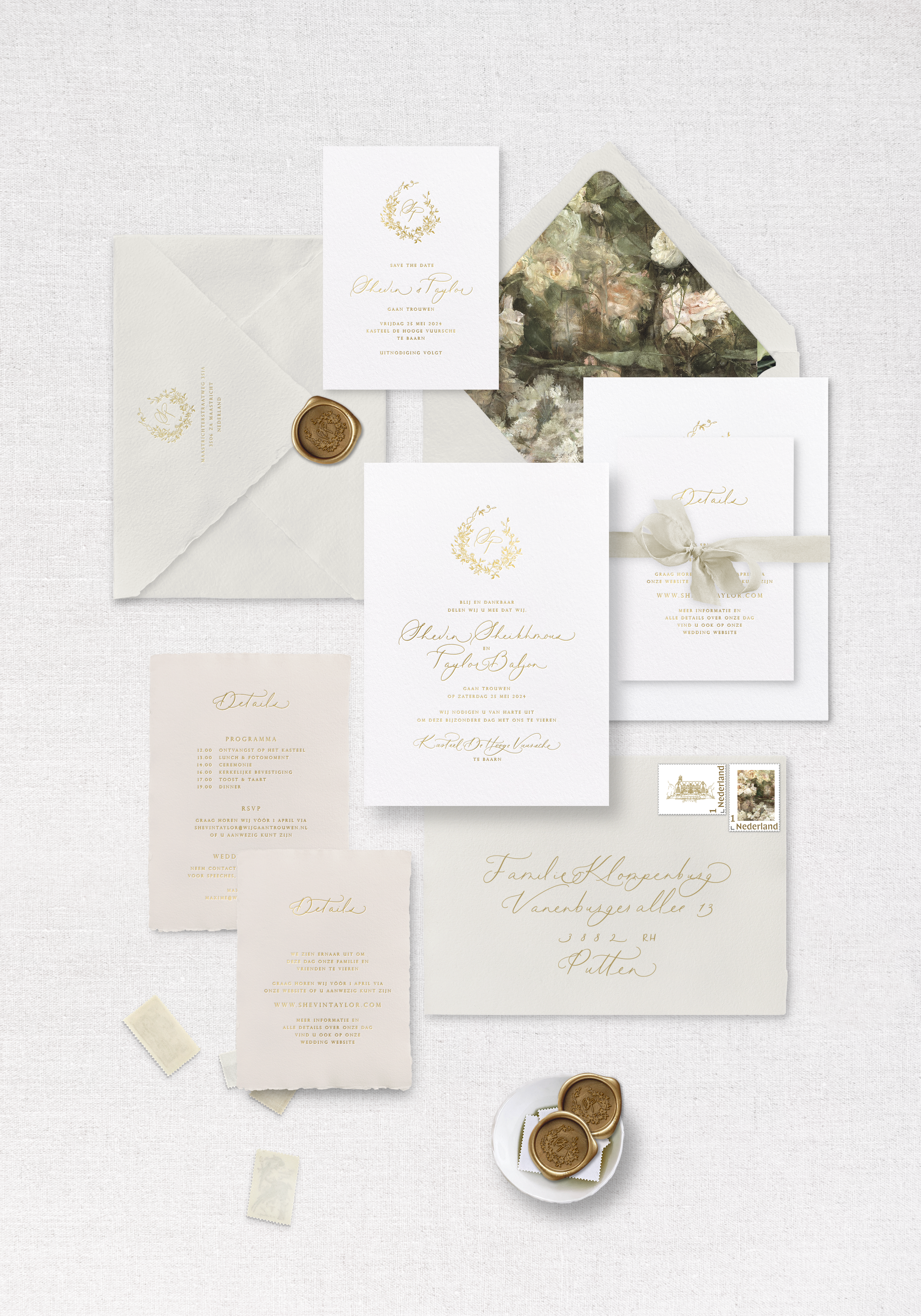 Al deze suites kunnen worden gepersonaliseerd met de kalligrafiestijl en drukkleur die jullie mooi vinden, met verschillende monogram- en illustratieopties en een zorgvuldig samengestelde selectie van luxe papier- en envelopsoorten in prachtige kleuren. Zo kun je er een suite van maken die uniek en persoonlijk is en die helemaal past bij de stijl van jullie bruiloft.