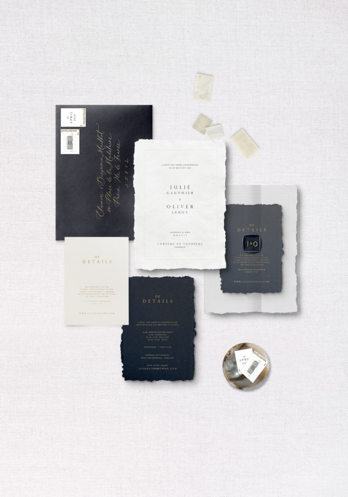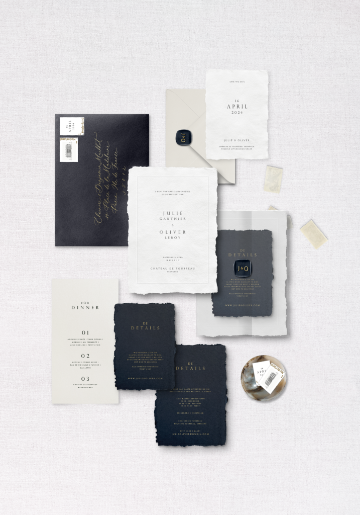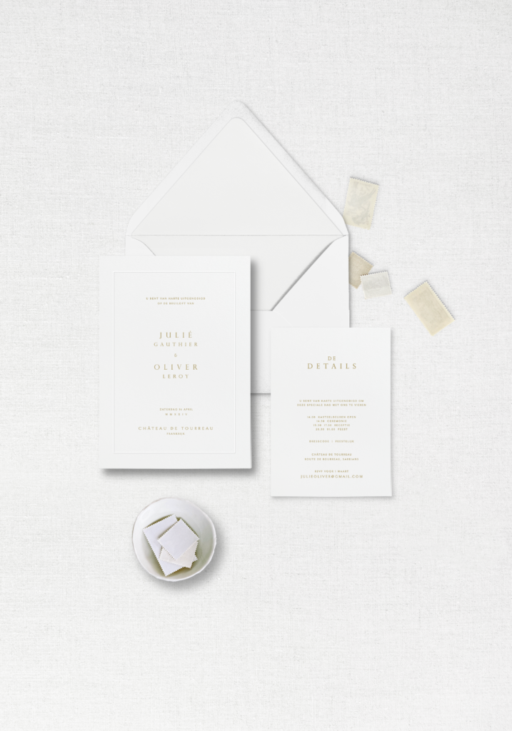 Maak de Moderne suite uniek en persoonlijk. Kies uit een selectie inktkleuren, kalligrafiestijlen en andere mooimakers die bij jullie stijl passen. Volg hiervoor de stappen in de La Lettre Collection Gids.
