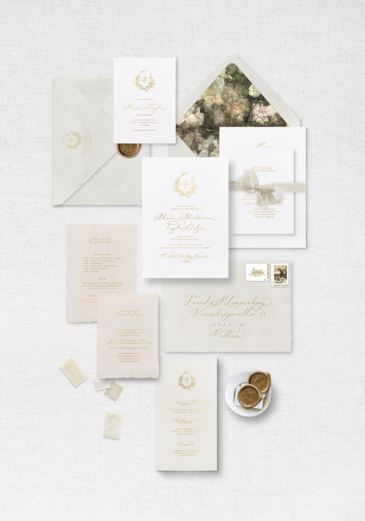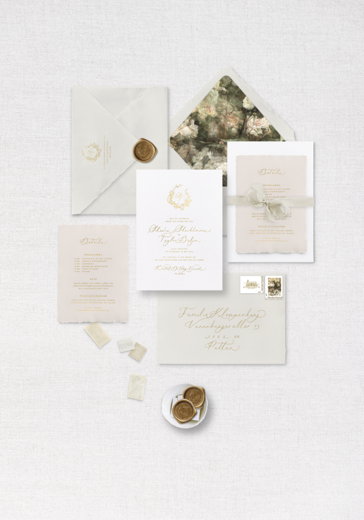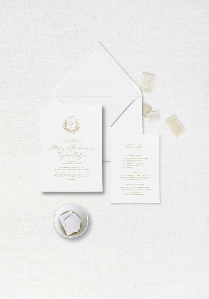 Maak de Monogramme suite uniek en persoonlijk. Kies uit een selectie inktkleuren, kalligrafiestijlen en andere mooimakers die bij jullie stijl passen. Volg hiervoor de stappen in de La Lettre Collection Gids.